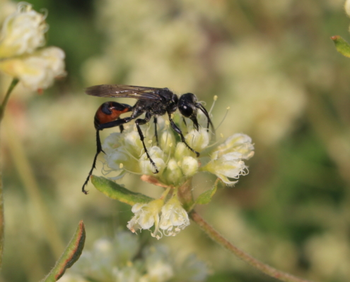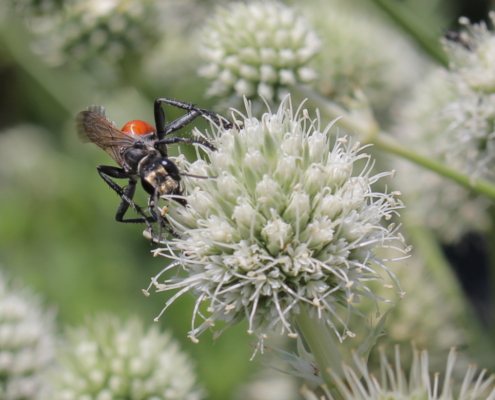 Sphex are another somewhat larger Thread-waisted Digger Wasp genus that prey on katydids and other Orthoptera. Females are ground-nesters and have pronounced tarsal-rake spines on their forelegs (like extra bristles on their front feet) that help them dig out their nests. They are common visitors to Rattlesnake Master (Eryngium yuccifolium).